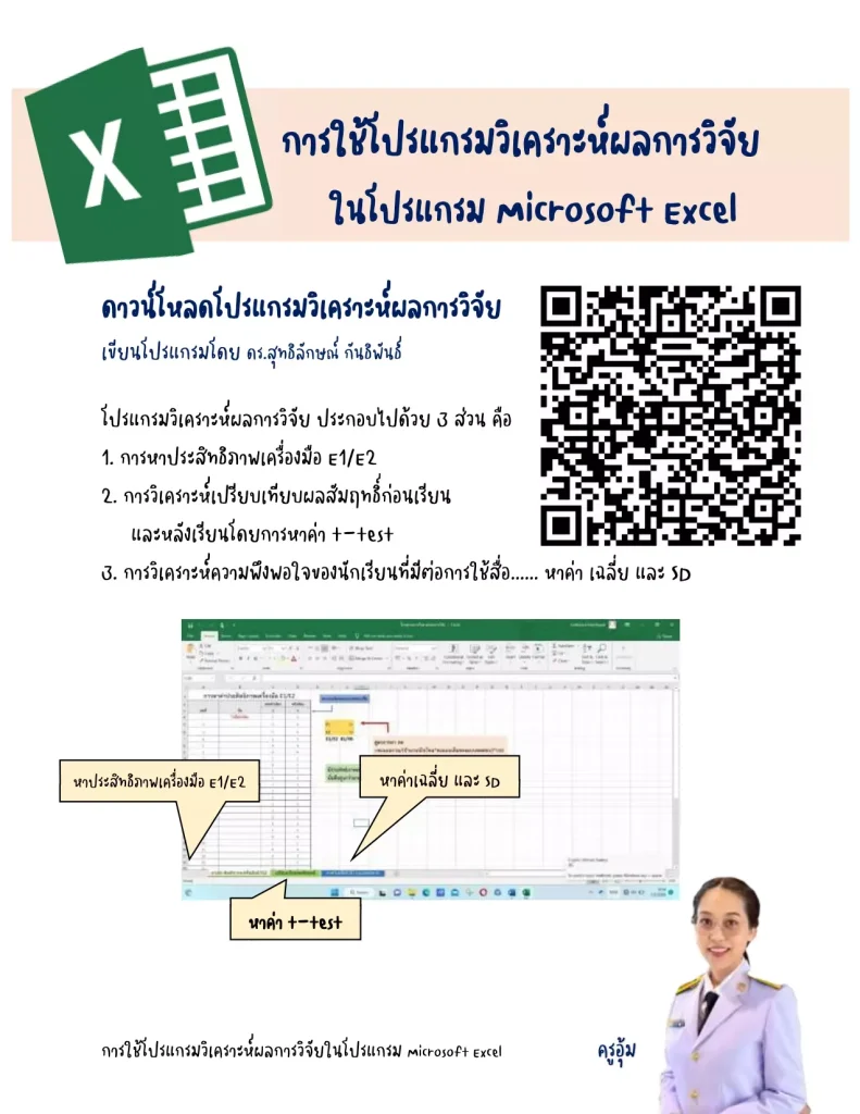 การทำวิจัยทางการศึกษาในปัจจุบันต้องอาศัยการวิเคราะห์ข้อมูลเชิงสถิติเพื่อให้ได้ผลลัพธ์ที่น่าเชื่อถือและสามารถนำไปใช้ประโยชน์ได้จริง สำหรับครูและนักวิจัยชาวไทยที่สนใจพัฒนานวัตกรรมการเรียนการสอน การเข้าใจเทคนิคการวิเคราะห์สถิติพื้นฐานจึงเป็นทักษะที่สำคัญยิ่ง โดยเฉพาะอย่างยิ่งการใช้โปรแกรม Microsoft Excel ซึ่งเป็นเครื่องมือที่หาได้ง่ายและใช้งานสะดวก บทความนี้จะนำเสนอเทคนิคการวิเคราะห์สถิติหลักที่ใช้ในงานวิจัยทางการศึกษา โดยอ้างอิงจากโปรแกรมวิเคราะห์ผลการวิจัยที่พัฒนาโดยดร สุทธิลักษณ์ กันธิพันธ์ ซึ่งครอบคลุมตั้งแต่การหาประสิทธิภาพเครื่องมือ การเปรียบเทียบผลสัมฤทธิ์ ไปจนถึงการวัดความพึงพอใจของผู้เรียน