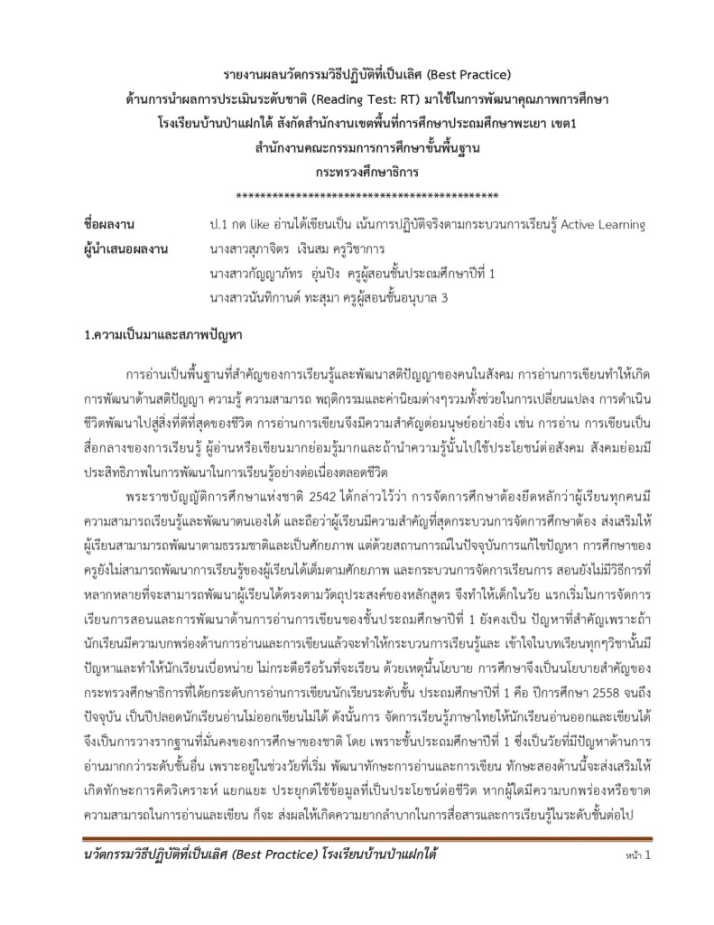แบ่งปันไฟล์ รายงานผลนวัตกรรมวิธีปฏิบัติที่เป็นเลิศ (Best Practice)ด้านการนำผลการประเมินระดับชาติ (Reading Test : RT) มาใช้ในการพัฒนาคุณภาพการศึกษา