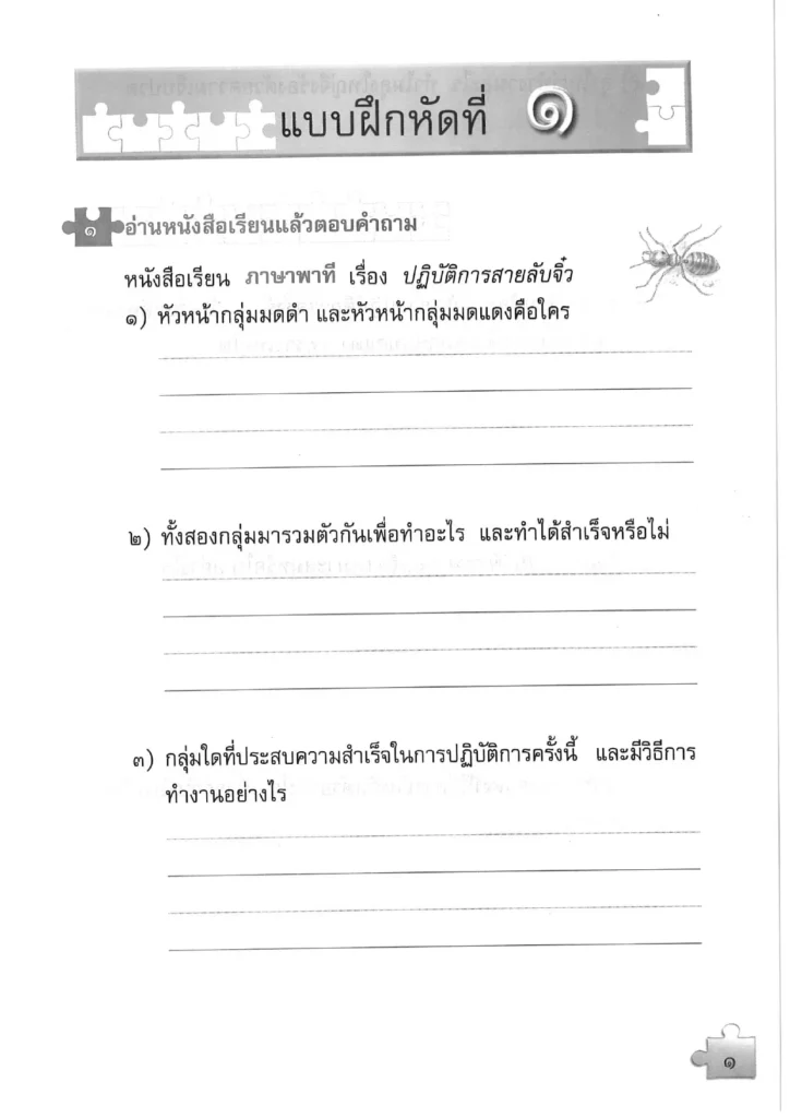 บทแรกของแบบฝึกหัดมีชื่อว่า ปฏิบัติการสายลับจิ๋ว ซึ่งสอดคล้องกับบทที่ 1 ของหนังสือเรียน ภาษาพาที เรื่องราวในบทนี้น่าจะเกี่ยวข้องกับการใช้ทักษะการสังเกตและการค้นหาข้อมูล ซึ่งเป็นทักษะพื้นฐานที่สำคัญสำหรับการเรียนรู้ กิจกรรมในบทนี้จะช่วยให้นักเรียนได้ฝึกการใช้สายตาและสมองในการแยกแยะรายละเอียดต่างๆ รวมถึงการใช้เหตุผลในการแก้ปัญหา